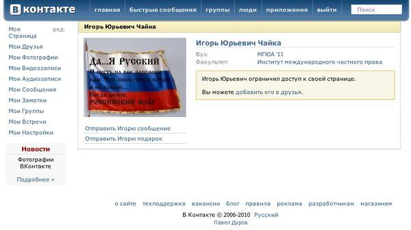 Как только история попала в интернет, Игорь Чайка тут же прикрыл свою страничку "В контакте". Там теперь вот такое патриотическое воззвание: