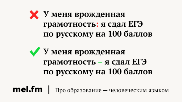 Всем бы такую грамотность. Но пока приходится читать Розенталя (или «Грамотность на Меле»). А тут ещё проще перепутать с двоеточием. Вроде как объясняется причина. Но вряд ли врождённая грамотность - это потому что кто-то сдал русский язык на 100 баллов. Скорее наоборот. Если вторая часть предложения выражает значение какого-то результата или следствия, ставим тире. Из союзов-подсказок придётся запоминать: «так что», «поэтому», «вследствие чего».