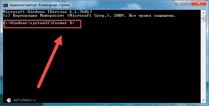 format [буква диска]: — форматирование произойдет без вопросов, в ту же ФС, что есть на диске, медленным способом (с полным стиранием).
