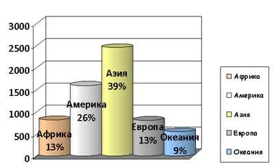 На графике показано, какие континенты наиболее часто становятся эпицентрами стихийных бедствий. Наиболее подвержена катаклизмам Азия. На втором месте стоит США. По мнению геологов, Северная часть Америки в скором времени может исчезнуть с лица земли из-за .