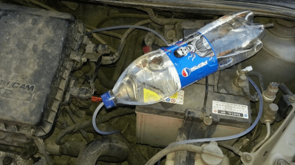 Внимание! Перед тестовой поездкой хорошо закрепите бутылку под капотом. Это можно легко сделать своими руками.