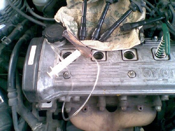 8. За время раскоксовки часть средства наверняка стечет в поддон, но часть может остаться и в цилиндрах. Эти остатки нужно удалить , иначе при первом же пуске можно схлопотать двигателя. Удобнее всего это делать шприцем, с привязанным к нему небольшим шлангом, который опускается в цилиндр. Таким образом отсосать нужно всю жидкость из всех цилиндров. Для надежности можно не вкручивая свечи покрутить мотор , если вдруг в цилиндре что осталось, то это выплеснется через свечные колодцы. Учитывая вредность раскоксовывателей лучше в это время около капота никому не стоять. Ну, или хотя бы накрыть двигатель тряпкой, чтобы жидкость в нее впиталась, а не разлеталась по подкапотному пространству.