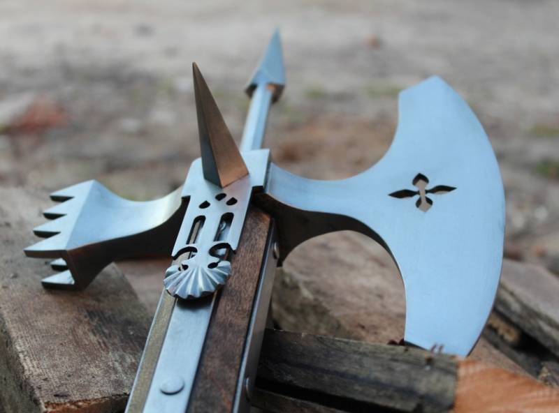 Алебарда, гизарма, глевия - это своего рода гибриды топора и копья. Лезвие, напоминающее аналогичное у секиры, совмещалось либо с острием копья, либо с заостренным крюком и насаживалось на длинное древко. Если топор - оружие рубящего типа, то такие гибриды должны еще и колоть, а при необходимости даже цеплять, стаскивать противника с седла или крепостного вала.