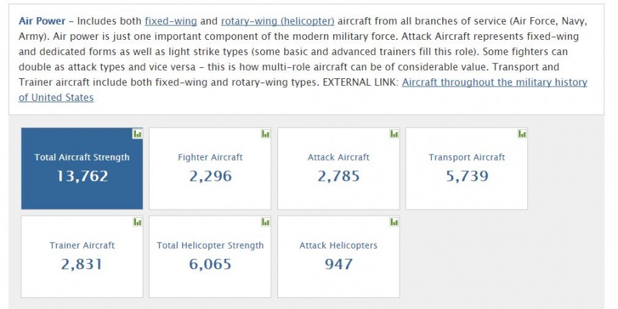 Статистика в Global Firepower по России далее: средств авиации – 3794, из которых 806 истребителей, 490 ударных (атакующих) вертолётов. Число танков: 20216. Число боевых кораблей в Военно-морском флоте: 352, включая один авианесущий крейсер («Адмирал Кузнецов») и 63 подводные лодки. Военный бюджет МО РФ в 2017 году оценен на уровне 44,6 млрд долларов.