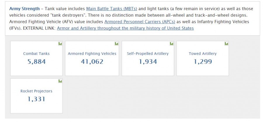 По силе бронетанковых соединений Россия оставила конкурентов далеко позади (20,216 тыс. единиц). На втором месте с большим отрывом следует Китай (6,457 тыс. единиц), а США попадает на третье место (5,8 тыс. единиц).