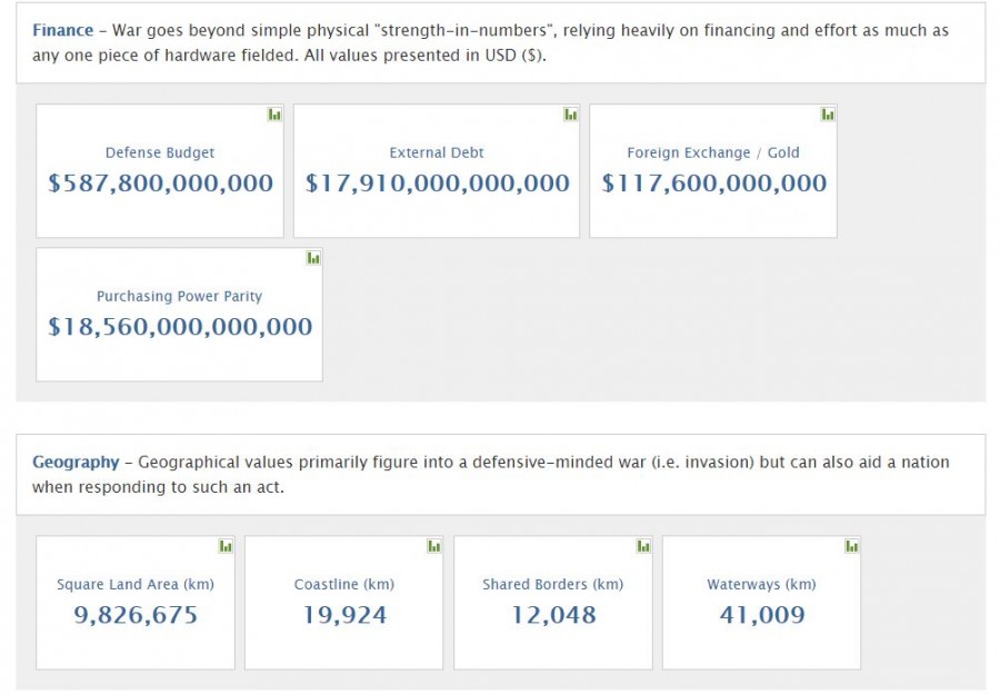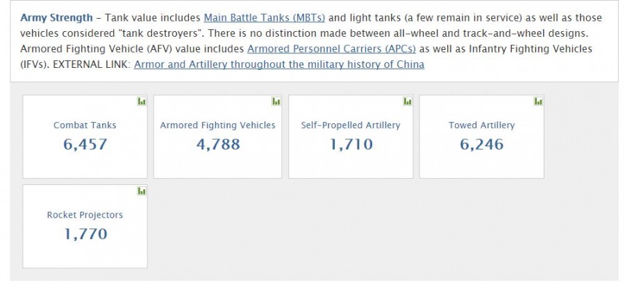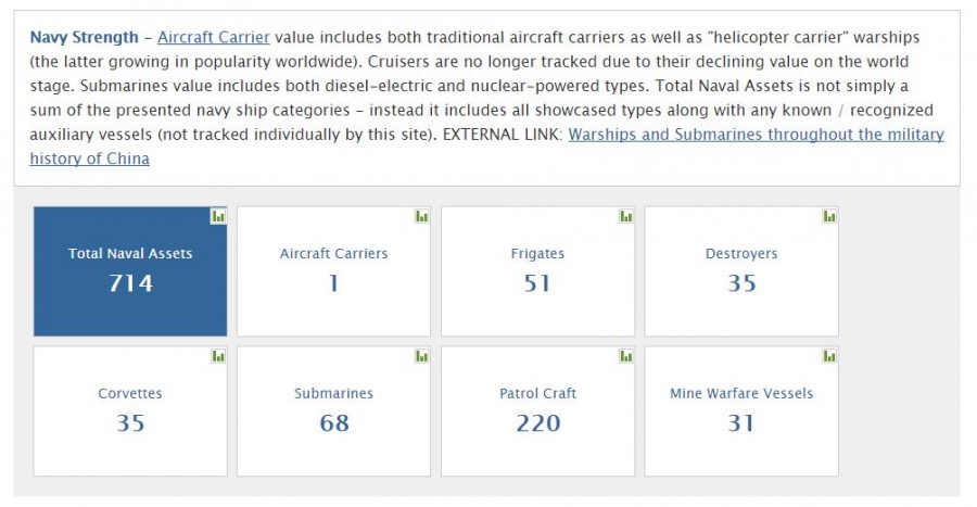 Число танков в китайской Народно-освободительной армии, по версии составителей рассматриваемого глобального рейтинга, 6457. Число боевых кораблей – 714. Если верить этому значению, то получается, что боевой флот Китая почти вдвое превосходит по численности боевой корабельный состав ВМС США. Уточняется, что среди этих 714 боевых кораблей 1 авианосец, 51 фрегат, 68 субмарин, 35 корветов и др. Китайский оборонный бюджет, как утверждается, составляет 161,7 млрд долларов. Официальная статистика по оборонному бюджету, опубликованная китайскими СМИ, выглядит следующим образом: 151,8 млрд долларов.