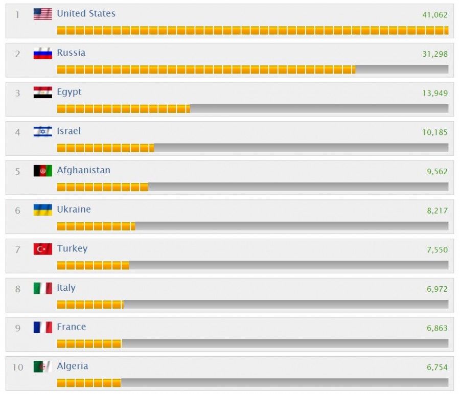 В первую десятку, кроме тройки лидеров — США, России и Китая, вошли Индия, Франция, Великобритания, Япония, Турция, Германия и Египет.