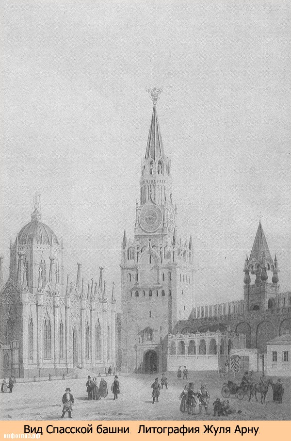 Когда появились кремлевские башенные часы, точно не известно. Есть предположение, что на Спасской башне они были поставлены вскоре после ее сооружения (1491 г.). Однако документальные подтверждения этого относятся к XVI веку. Кем были устроены часы и какие они были, точно пока не установлено. В архивных материалах только под 1585 г. встречается упоминание о часовщиках Фроловских (Спасских), Троицких и Тайницких ворот. Сохранились документы, по которым видно, что часовщики получали за свою работу по 4 рубля и 2 гривны в год жалования да по 4 аршина сукна на одежду.