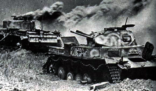 Но техника горела не только на земле, но и в воздухе. Подбитые самолеты пикировали и взрывались прямо в гуще сражения. Танковые экипажи обеих враждующих сторон покидали свои горящие машины и смело вступали в рукопашную схватку с врагом, орудуя при этом автоматами, ножами и даже гранатами. Это было настоящее страшное месиво из людских тел, огня и металла. По воспоминаниям одного из очевидцев, вокруг все горело, был невообразимый шум, от которого болели уши, по-видимому, именно так и должен выглядеть ад.