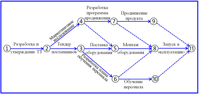 Устройство проектной задачи таково, что в процессе ее реализации место есть только одному начальному и одному конечному событию. До начального события и после конечного события работы не выполняются. В момент конечного события проект считается завершенным. До наступления промежуточного события все входящие операции должны быть выполнены. Оно дает старт всем исходящим из него операциям. Фиктивные работы применяются после работ, если неизвестно, какая из них окажется последней.