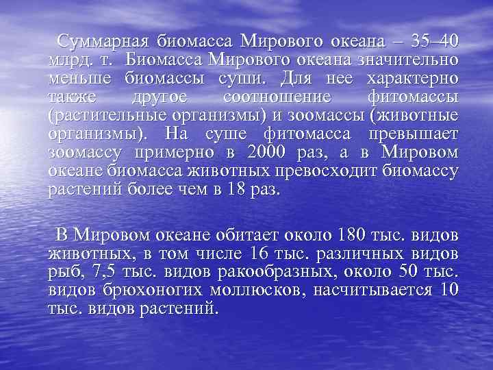 Суммарная биомасса Мирового океана – 35– 40 млрд. т. Биомасса Мирового океана значительно меньше биомассы суши. Для нее характерно также другое соотношение фитомассы (растительные организмы) и зоомассы (животные организмы). На суше фитомасса превышает зоомассу примерно в 2000 раз, а в Мировом океане биомасса животных превосходит биомассу растений более чем в 18 раз. В Мировом океане обитает около 180 тыс. видов животных, в том числе 16 тыс. различных видов рыб, 7, 5 тыс. видов ракообразных, около 50 тыс. видов брюхоногих моллюсков, насчитывается 10 тыс. видов растений.
