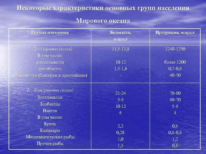 Некоторые характеристики основных групп населения Мирового океана Группа населения Биомасса, млрд. т Продукция, млрд. т 1. Продуценты (всего) В том числе: фитопланктон фитобентос микрофлора (бактерии и простейшие) 11, 5 -13, 8 1240 -1250 10 -12 1, 5 -1, 8 - более 1200 0, 7 -0, 9 40 -50 21 -24 5 -6 10 -12 6 70 -80 60 -70 5 -6 4 2, 2 0, 28 1, 0 1, 5 0, 9 0, 8 -0, 9 1, 2 0, 6 2. Консументы (всего) Зоопланктон Зообентос Нектон В том числе: Криль Кальмары Мезопелагические рыбы Прочие рыбы