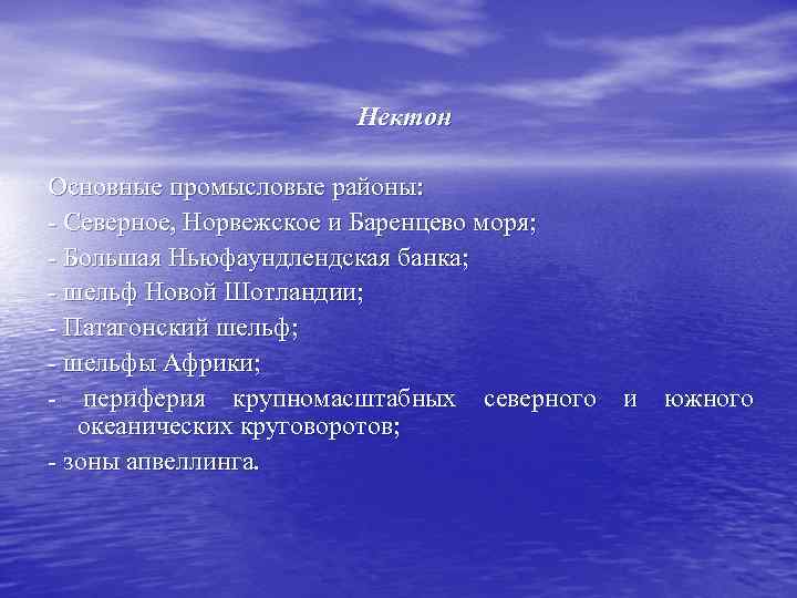 Нектон Основные промысловые районы: - Северное, Норвежское и Баренцево моря; - Большая Ньюфаундлендская банка; - шельф Новой Шотландии; - Патагонский шельф; - шельфы Африки; - периферия крупномасштабных северного и южного океанических круговоротов; - зоны апвеллинга.