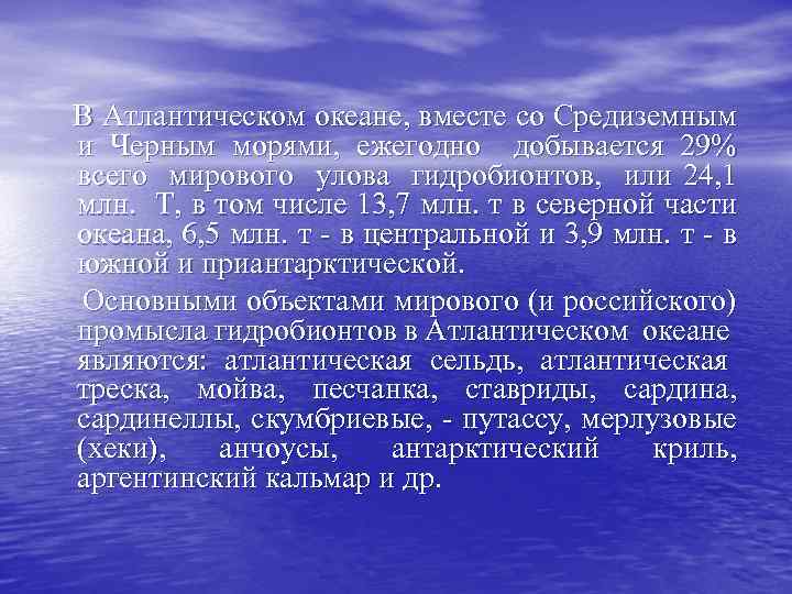 В Атлантическом океане, вместе со Средиземным и Черным морями, ежегодно добывается 29% всего мирового улова гидробионтов, или 24, 1 млн. Т, в том числе 13, 7 млн. т в северной части океана, 6, 5 млн. т - в центральной и 3, 9 млн. т - в южной и приантарктической. Основными объектами мирового (и российского) промысла гидробионтов в Атлантическом океане являются: атлантическая сельдь, атлантическая треска, мойва, песчанка, ставриды, сардина, сардинеллы, скумбриевые, - путассу, мерлузовые (хеки), анчоусы, антарктический криль, аргентинский кальмар и др.