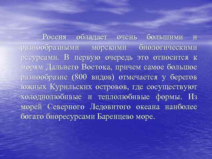 Россия обладает очень большими и разнообразными морскими биологическими ресурсами. В первую очередь это относится к морям Дальнего Востока, причем самое большое разнообразие (800 видов) отмечается у берегов южных Курильских островов, где сосуществуют холоднолюбивые и теплолюбивые формы. Из морей Северного Ледовитого океана наиболее богато биоресурсами Баренцево море.