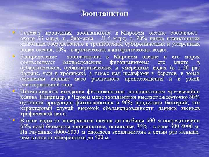 Зоопланктон Годовая продукция зоопланктона в Мировом океане составляет около 53 млрд. т. , биомасса - 21, 5 млрд. т. 90% видов планктонных животных сосредоточено в тропических, субтропических и умеренных водах океана, 10% - в арктических и антарктических водах. Распределение зоопланктона в Мировом океане и его морях соответствует распределению фитопланктона: его много в субарктических, субантарктических и умеренных водах (в 5 -20 раз больше, чем в тропиках), а также над шельфами у берегов, в зонах смешения водных масс различного происхождения и в узкой экваториальной зоне. Интенсивность выедания фитопланктона зоопланктоном чрезвычайно велика. Например, в Черном море зоопланктон выедает ежесуточно 80% суточной продукции фитопланктона и 90% продукции бактерий; это характерный случай высокой сбалансированности данных звеньев трофической цепи. В слое воды от поверхности океана до глубины 500 м сосредоточено 65% всей биомассы зоопланктона, остальные 35% - в слое 500 -4000 м. На глубинах 4000 -8000 м биомасса зоопланктона в сотни раз меньше, чем в слое от поверхности до 500 м.