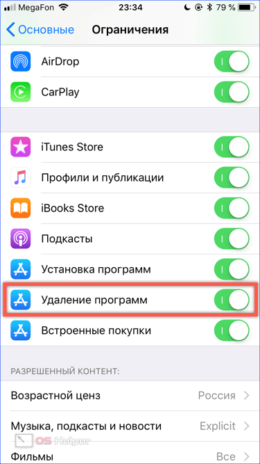 Установив выключатель ограничений в правильное положение, можно возвращаться на домашний экран и удалять ненужное ПО.