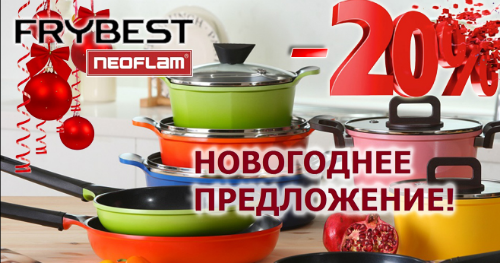 И сейчас, в предновогодние дни, именно на них действует хорошая скидка - 20%. Успейте купить в подарок себе и своим любимым самые популярные у хозяек блинницы FRYBEST, яркие сотейники и сковороды и наполнить кухню бесподобным праздничным настроением на весь год