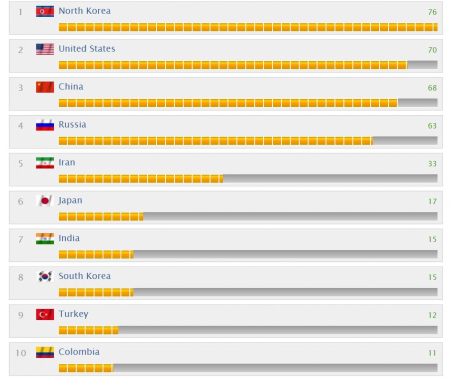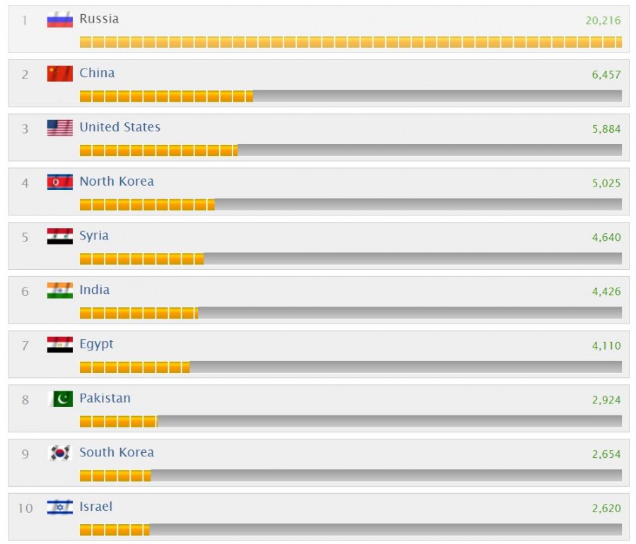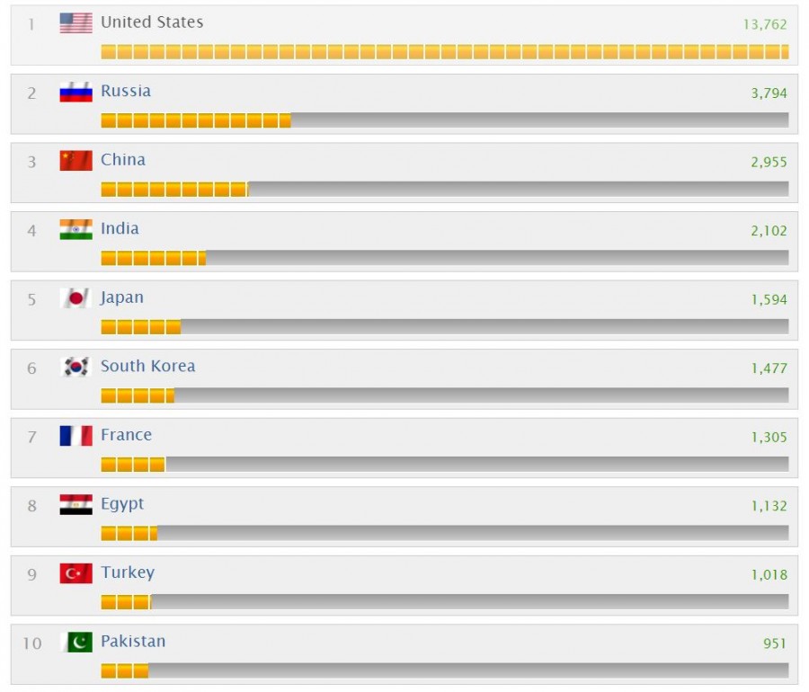 Первая тройка уже длительное время изменений не претерпевает – США на первом, Россия на втором, Китай на третьем.