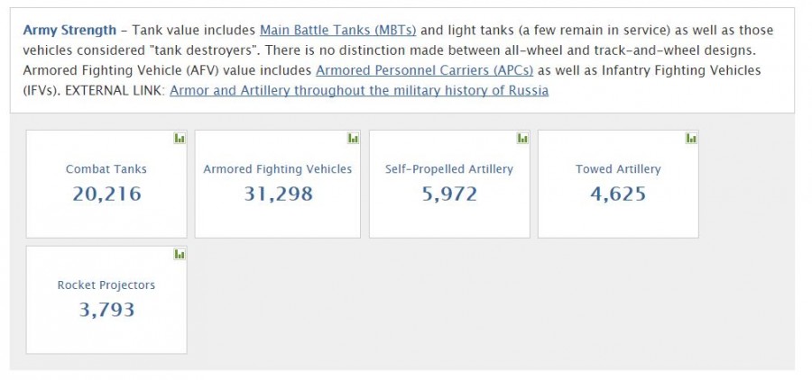 Российская армия по своей численности соперничает с китайской, индийской и американской, хотя население каждой из этих стран намного больше российского. К тому же по количеству танков Россия превосходит Китай и США вместе взятые, да и военно-воздушные силы больше китайских. А вот морской флот у РФ относительно малочисленный, и авианосец в нём всего один.