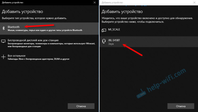 Дальше выбираем "Bluetooth". Компьютер начнет искать доступные для подключения устройства. Наше устройство должно быть в режиме поиска. В моем случае, это наушники. Там есть отдельная кнопка. Когда они в режиме подключения, то на них мигает индикатор. Когда компьютер обнаружит наше устройство, просто выбираем его и подключаемся.