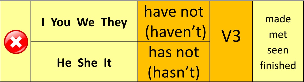 Подлежащее + have\has + not + V3 + второстепенные члены предложения