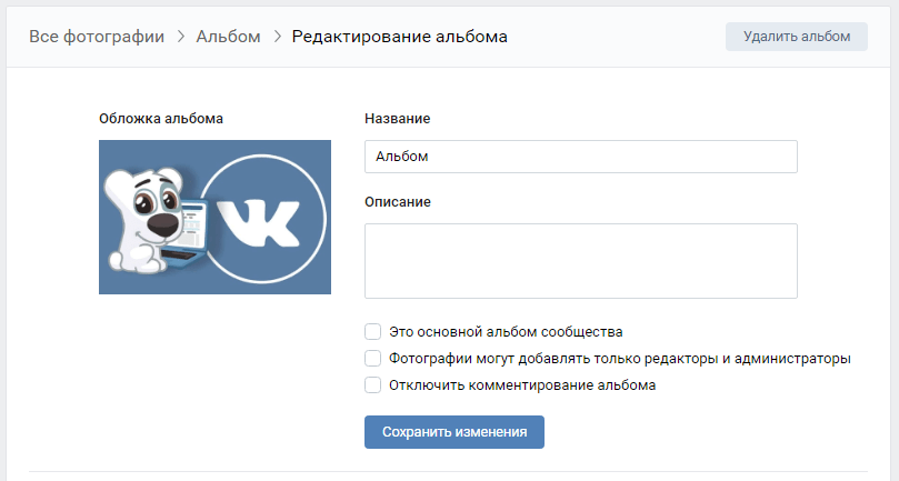 - Далее открывается окно редактирования. Здесь можно выбрать обложку, изменить название и описание, настроить доступ, скрыть комментарии или сделать фотоальбом основным.