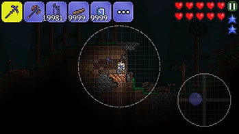 Графика в Terraria двухмерная, но это ни чуть не портит игровой процесс, а наоборот дополняет, делает его олдскульным и уникальным. Управление разделено на два джойстика: левый служит для передвижения, правый - для взаимодействия с окружающей средой. Тап в определенное место увеличивает нужный объект словно лупа, что дает возможность точного прицеливания.