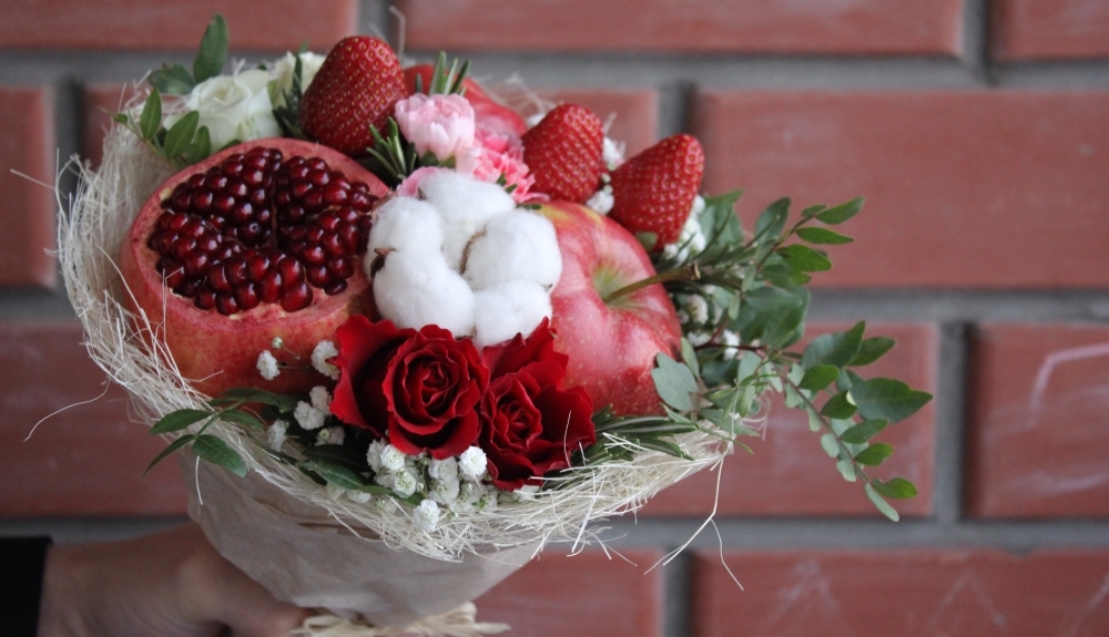 Совет: если подойти к процессу творчески, то можно создать огромное количество интересных букетов на любой вкус и кошелек. Например, мужчинам нравятся наборы из острого перца чили, красного лука, чеснока и вяленой рыбы (не лишней там будет и бутылка пива). Женщины любят фруктовые букеты, особенно цитрусовые, а также из клубники с добавлением маршмеллоу и нежных зефирок.