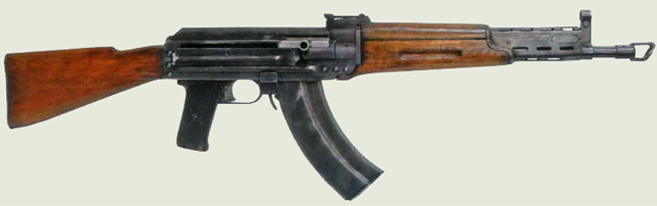 Принят на вооружение Советской армии в 1949 г. Серийно выпускался с 1949 по 1957 гг. в двух вариантах - с постоянным и складным металлическим прикладом. Автоматическое действие основано на использовании энергии части пороховых газов, отводимых из ствола. Запирание канала ствола осуществляется двумя боевыми упорами при повороте за счет взаимодействия выкупа затвора с фигурным пазом затворной рамы, подача патронов - из 30-местного секторного магазина. Ударно-спусковой магазин позволяет вести одиночный и автоматический огонь, автомат оснащается съемным штык-ножом.