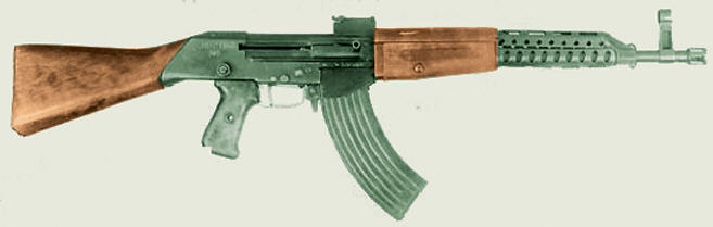 18. Вариант советского АКМС. Это версия советского АКМ со складывающимся вниз прикладом. Сделан под патрон 7,62x39мм, штампованная ствольная коробка. Имеет металлический приклад как у немецкого пистолета-пулемета MP-40, кованый хромированный ствол длиной 16,1 дюймов, ламинированные деревянные накладки, синтетическую пистолетную рукоятку и скошенный дульный тормоз-компенсатор. Автомат, изображенный на фото, был произведен из деталей, которые были изъяты Израилем у армии освобождения Палестины во время конфликта в Ливане в 80-х годах.