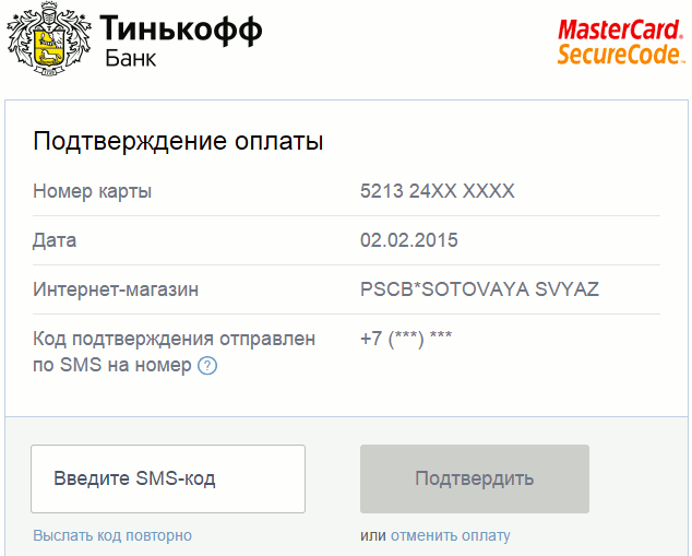 При выборе любого способа оплаты (банковской картой или непосредственно с кошелька), платеж нужно подтвердить при помощи СМС, которое поступит на мобильный к которому привязан счет.