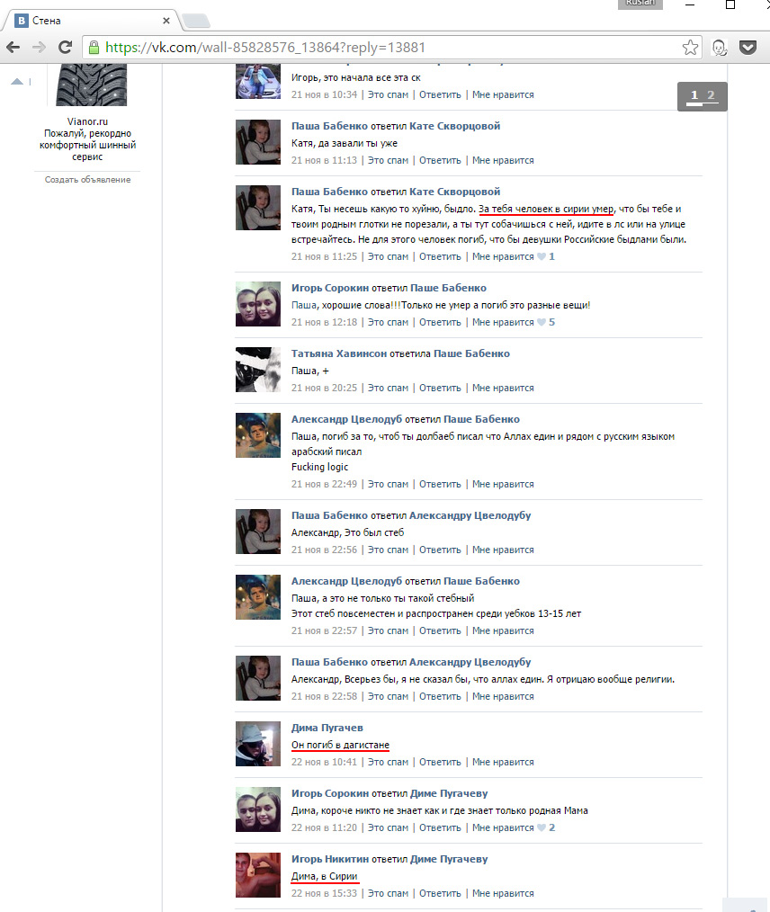 Чуть позже в той же группе появилась вторая публикация, в комментариях к которой уже другой человек сказал, что Журавлёв погиб в Сирии. Также в комментариях один человек написал, что он погиб в Дагестане — эту версию мы рассмотрим ниже, однако этого человека поправил автор первого поста, снова сказав, что Фёдор погиб в Сирии: