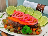 Это прекрасное пикантное блюдо. Легкое, вкусное. Просто восторг. Рыбу можно заменить на любую другую красную, но вкус немного изменится. Блюдо не требует гарнира, так как готовится сразу с ним. Пикантность придает именно маринованный лук.