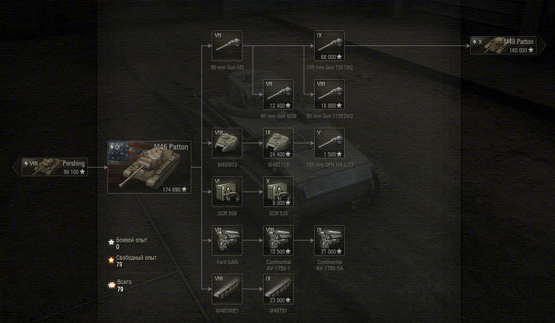 Это машины 9 уровня, долгое время именно она являлась венцом развития СТ США. Сейчас стоимость машины составляет 3 450 000 кредитов и 174 690 опыта. Суммы уже достаточно значительные и так просто наскоком их не достичь. Придется медленно и мучительно фармить как опыт, так и кредиты. Однако сделать это будет не так уж и сложно т. к. на першинге опыт будет зарабатываться быстро, а кредиты можно активно фармит и на других машинах. Единственное что необходимо учитывать - на покупке машины все расходы только начнутся, а не закончатся. Сразу же нам необходимо поставить на машину дополнительное оборудование, но если это проблему отчасти можно решить переносом оборудования с першинга всего за 30 золотых, то с экипажам придется немного помучаться. Специальности у нас полностью совпадают, поэтому можно смело переобучать экипаж с першинга. Однако я уже неоднократно говорил, что экипаж существенно влияет на характеристики машины, поэтому желательно сразу его переобучать до 100% владения основной специальностью. Сделать это можно несколькими способами: