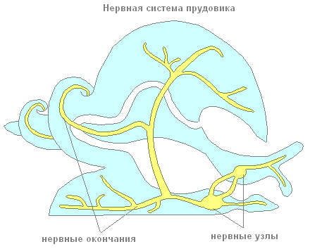 Нервная система у прудовика узлового типа и включает окологло-точное нервное кольцо, образованное двумя узлами и че-тыре пары узлов с отходящими от них нервами. Материал с сайта