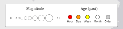 Размер кружков на карте и их цвет зависит от силы толчков и того, как давно они произошли: