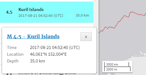 В левой части окна отображается лента сейсмических событий в мире (самые свежие вверху). Кликнув на любое из них, Вы переместитесь в нужную точку на карте мира и увидите подробности во всплывающем окошке: