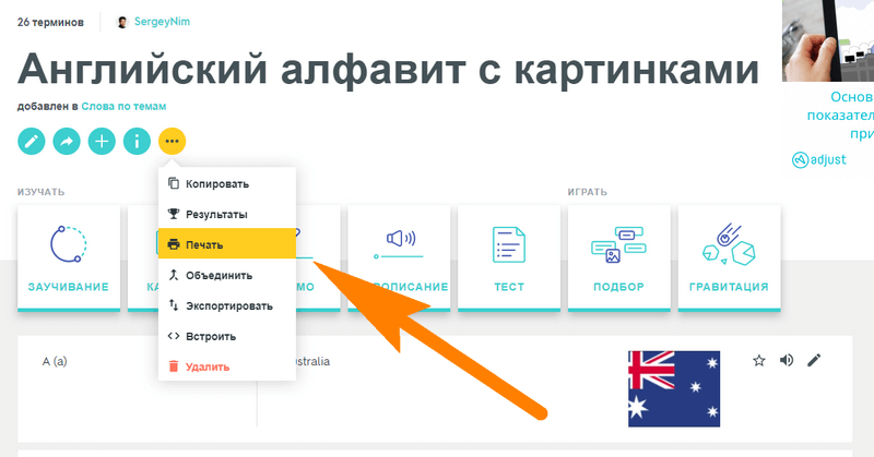Сохранив набор, нажмите на «Печать» (где спрятана эта кнопка, смотрите на картинке ниже) и выберите нужный формат печати. Лучше всего подойдут крупные карточки на листе А4 (нужно выбрать формат “большой”). Нажмите “Сохранить PDF” и распечатайте файл.