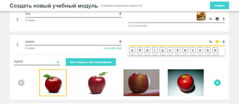 Возможно, вы не найдете подходящую иллюстрацию для специальных терминов, но вряд ли они понадобятся, если вы делаете карточки, скажем, для второго класса. Обратите внимание, что картинка появится в поле “Определение”, а не “Термин”. Иначе говоря, определением может быть не только перевод слова, но и картинка или перевод + картинка.