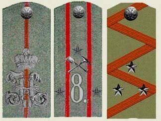 Примечание. С 1814 года расцветки погон нижних чинов, а естественно с 1854 и офицерских погон определялись порядковым местом полка в дивизии. Так в первом полку дивизии погоны красные, во втором - белые, в третьем светло -синие. Для четвертых полков погоны темно-зеленые с красной выпушкой. В гренадерских полках погоны желтые. У всей артиллерии и в инженерных войсках погоны красные. Это в армии.