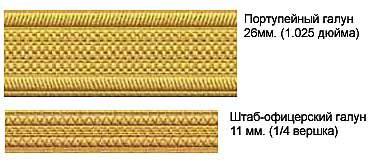 Однако, используя стандартный портупейный галун того времени: (узкий 1/2 вершка (22мм) или широкий 5/8 вершка (27.8мм.)) добиться регламентированных просветов и краев при регламентированной ширине погона невозможно. Поэтому, производители погон либо шли на некоторое изменение ширины галунов, либо на изменение ширины погон..