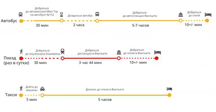 Время в пути от центра Хошимина до центральных районов Фантьета занимает от 5 до 6 часов, также, как и поездка на автобусе. Дороги достаточно узкие и особых преимуществ у водителей такси на них нет.