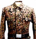 SS-Erbsenmuster, getarnter Drillichanzug. Упрощенный вариант камуфляжа вермахта образца марта 1944 года. Универсальная расцветка, без разделения на зимнюю и летнюю. Костюмы и комбинезоны этой расцветки шились по общим неразмерным лекалам. Подгонка камуфляжа по фигуре происходила на местах.Специальным указом было утверждено требование каждому военнослужащему иметь не менее 2 предметов камуфляжной расцветки. |