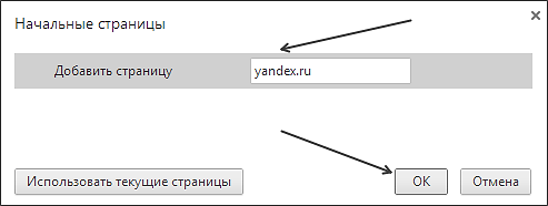 Здесь можно указать, какие страницы должны открываться при запуске браузера. В нашем случае вводим «yandex.ru» и закрываем окно с помощью кнопки «ОК». Все, после этого в качестве стартовой странице в вашем браузере Google Chrome будет использоваться сайт поисковой системы Яндекс.