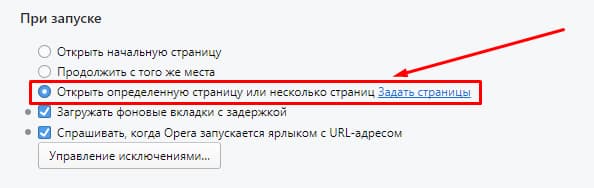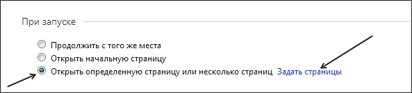 2. Во вкладке «При запуске», выберите чек-бокс «Открывать определенную страницу или несколько страниц» и нажмите «Задать страницы».