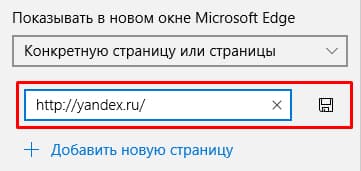 2. Во вкладке, указанной на картинке, выберите пункт «Конкретную страницу или страницы». В поле, расположенном ниже, введите url адрес поисковой машины – https://www.yandex.ru, и нажмите на иконку дискеты, чтобы сохранить изменения.