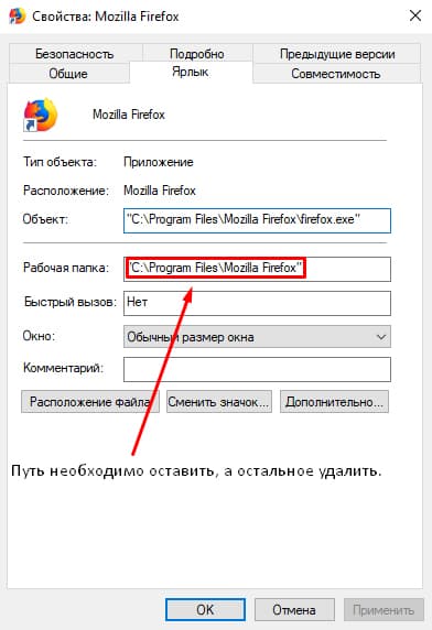 Кликните правой кнопкой мыши на значок браузера и выберите «Свойства», перейдите в раздел «Ярлык» и удалите все лишние надписи, не трогая непосредственного пути к файлу.