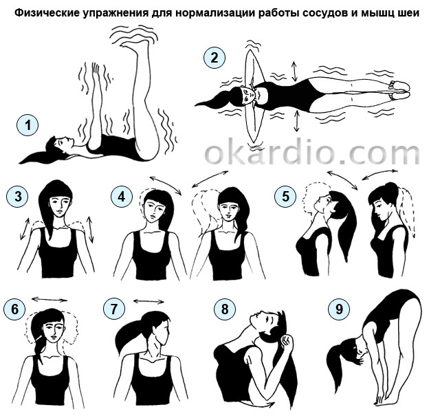 Задачей описанных ниже физических упражнений служит нормализация работы сосудов и мышц шеи, нервной и эндокринной систем, сердечной мышцы. Это позволяет создать идеальные условия для работы сосудов головного мозга.