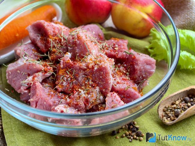 - В приготовленный маринад погружаем мясо и оставляем его там пропитываться на 30-40 минут.